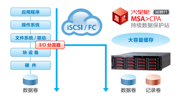 同时,使用分流器也可以实现对服务器内置存储的持续数据保护,包括操作系统和数据卷的保护,支持通过FC及iSCSI协议进行SAN Boot,达到立即恢复应用系统的目的。