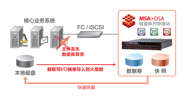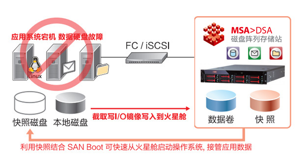 在应用系统盘故障,系统无法启动时,通过FC或iSCSI连接到火星舱,使用火星舱的SAN Boot功能,能够立即使应用服务器重新开机。无需重新安装即可恢复操作系统正常运行,启动后还可以将火星舱的数据恢复到原有的操作系统。