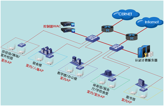 1、灵活丰富的无线覆盖:针对宿舍楼、办公楼、图书馆、体育馆、田径场等不同的场景特性提供灵活多样的无线覆盖方案;
