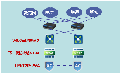 在互联网出口处部署深信服AD、AC和下一代防火墙设备,加速访问,提升带宽利用率,净化网络流量、保障校园网安全。