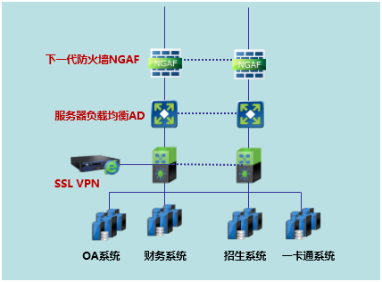 2、服务器负载均衡AD:优化学生选课、查分高峰期,以及招生期间的服务器性能,保障系统的稳定可靠性,利用单边加速技术提升对业务系统的的访问速度,通过提供智能报表分析,为学校提供网络优化和改造的依据;