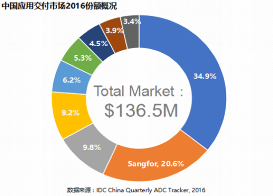 据IDC的官方数据显示,2016年全年,中国ADC(应用交付)市场继续保持高速增长,按厂商收入统计,市场容量已接近10亿元人民币,年增长率近20%。以深信服为首的国内ADC厂商正在挑战传统国外厂商的垄断地位,包括F5在内的多家国外厂商市场占有率继2015年之后再次出现下滑。