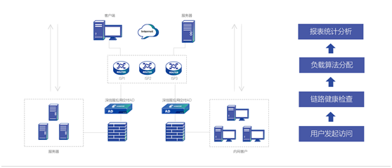 当用户发起对外部网站的访问时,深信服多链路负载均衡设备通过灵活的算法,帮助用户选择更优的上网链路。
