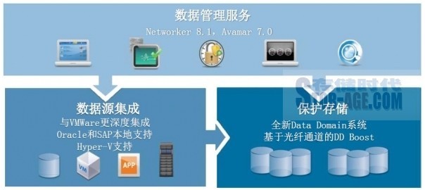 其次是与应用(数据源)的紧密整合。为了帮助用户自助服务,EMC从Oracle、VMware、微软的角度进行了加强。对Oracle的支持包括提升数据库管理员和系统管理员的可视性和控制能力,并成为首个获得Oracle Exadata备份认证的消重存储;DD Boost可以支持Oracle版SAP环境,并对SAP HANA进行了整合与优化。同时还可以支持VMware的vSphere环境,而VMware自己也利用EMC来保护本公司的数据。对微软Hyper-v的扩展支持与对VMware的支持比较类似。