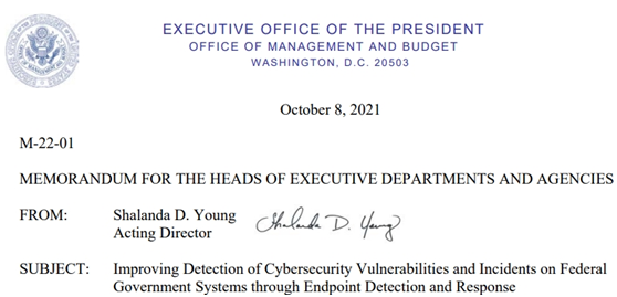 2021年10月8日,拜登发布了第14028号行政令,要求联邦政府通过部署EDR来改进系统中网络安全漏洞和事件的检测能力,可谓是美国政府对部署EDR计划的进一步实施。