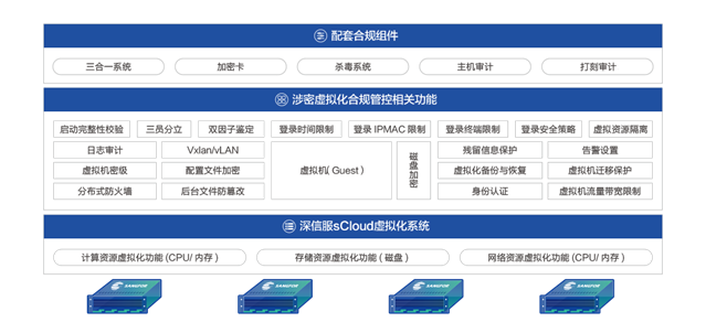 sCloud平台已经通过国家保密评测,具备完整的涉密资质。同时方案配套了分保检查所需的相关组件,可以帮助用户的虚拟化平台实现全面合规。
