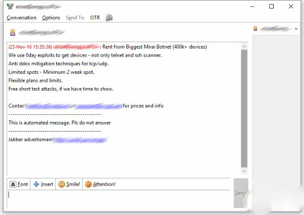 两名之前涉嫌大规模商业间谍的罪犯,Bestbuy和Popopret,正滥用XMPP/Jabber即时消息协议发送广告,提供由40万台Mirai感染设备组成的僵尸网络租赁服务。他们的广告承诺,该僵尸网络是早期Mirai的重大改进版,配备了IP地址欺骗功能,让受害者更难以封锁洪水流量。