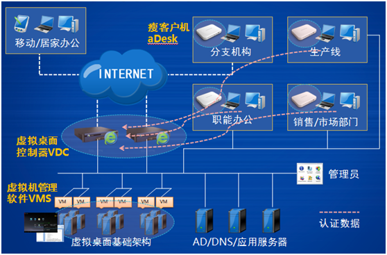 整体桌面云方案是由瘦客户机aDesk、虚拟桌面控制器VDC、虚拟机管理软件VMS、服务器存储设备等组成,实现将企业员工的办公桌面统一部署于服务器上,然后通过网络(局域网或广域网)将个人桌面系统快速交付给员工,员工可以通过各种不同类型的终端设备如瘦客户机、笔记本、手机及平板等随时随地接入办公,打造一种新型的桌面办公模式。