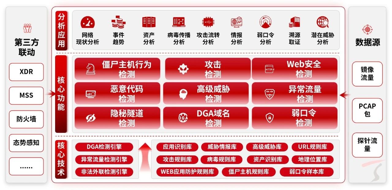 产品可以作为探针组件,为XDR(扩展检测与响应)注入强大的威胁识别能力,助力实现从检测到响应的全流程安全闭环管理。此外,产品还能无缝补充防火墙等安全产品的威胁检测功能,弥补其在威胁深度检测方面的短板,构建起多层次的网络安全防线。